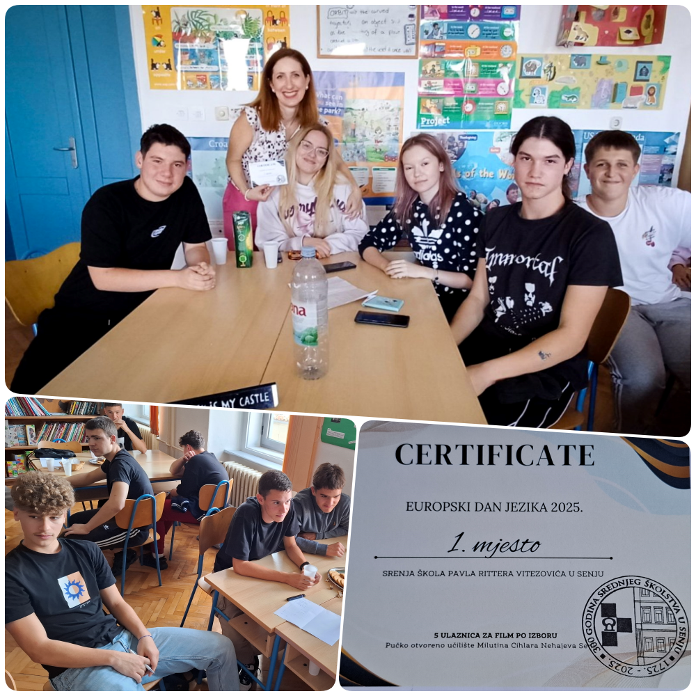 Svake godine 26. rujna škole diljem Lijepe Naše obilježavaju Europski dan jezika na različite načine. Učenici Srednje škole Pavla Rittera Vitezovića u Senju rado sudjeluju u obilježavanju Europskog dana jezika, stoga se trudimo svake godine nuditi nove aktivnosti kako bi bili još motiviraniji. Protekli tjedan obilježili smo u našoj školi nizom aktivnosti na nastavi jezika. Kao rezultat prevođenja na satovima jezika, nastali su qr kodovi na kojima se nalaze poučne zanimljivosti o svijetu jezika (na hrvatskom, engleskom i njemačkom jeziku) te smo ukrasili zidove škole i proučavali razne druge zanimljivosti i novine u svijetu jezika, kako bi se učenici bolje pripremili za jezični kviz koji se održao u petak, 26. rujna 2025.