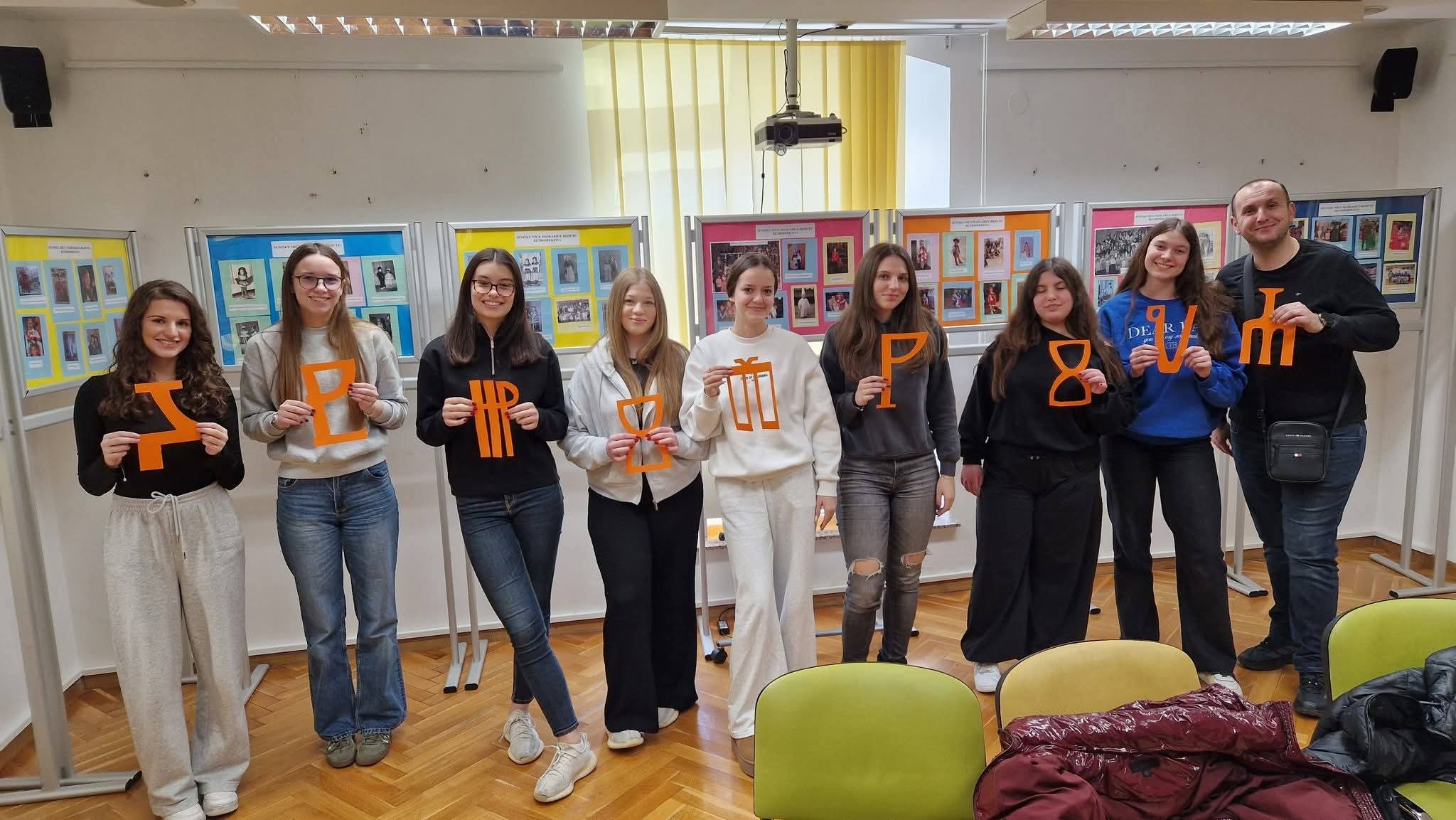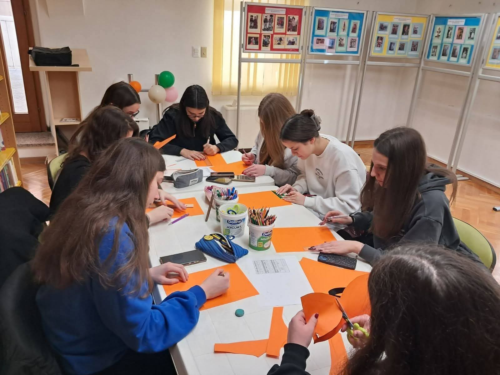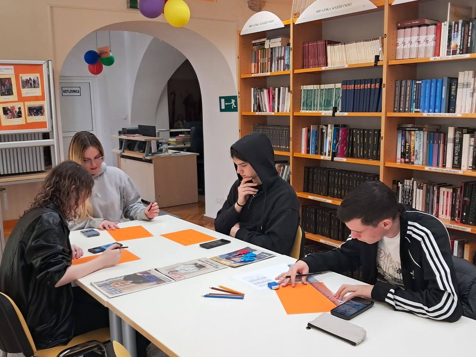 U nastavku programa uslijedila je glagoljska radionica -srednjoškolci su izrađivali glagoljični natpis knjižnica Senj koji će krasiti predvorje senjske knjižnice.