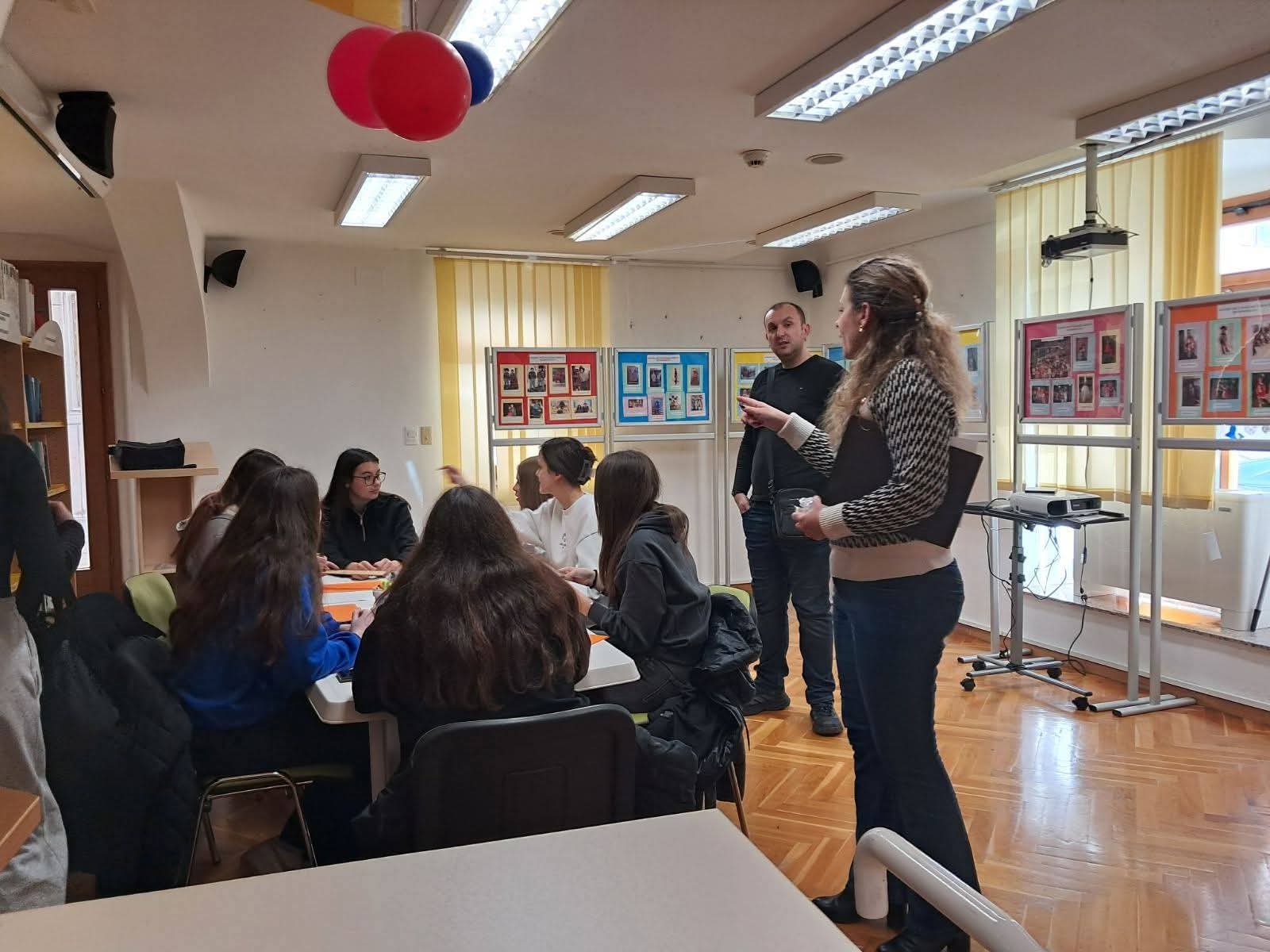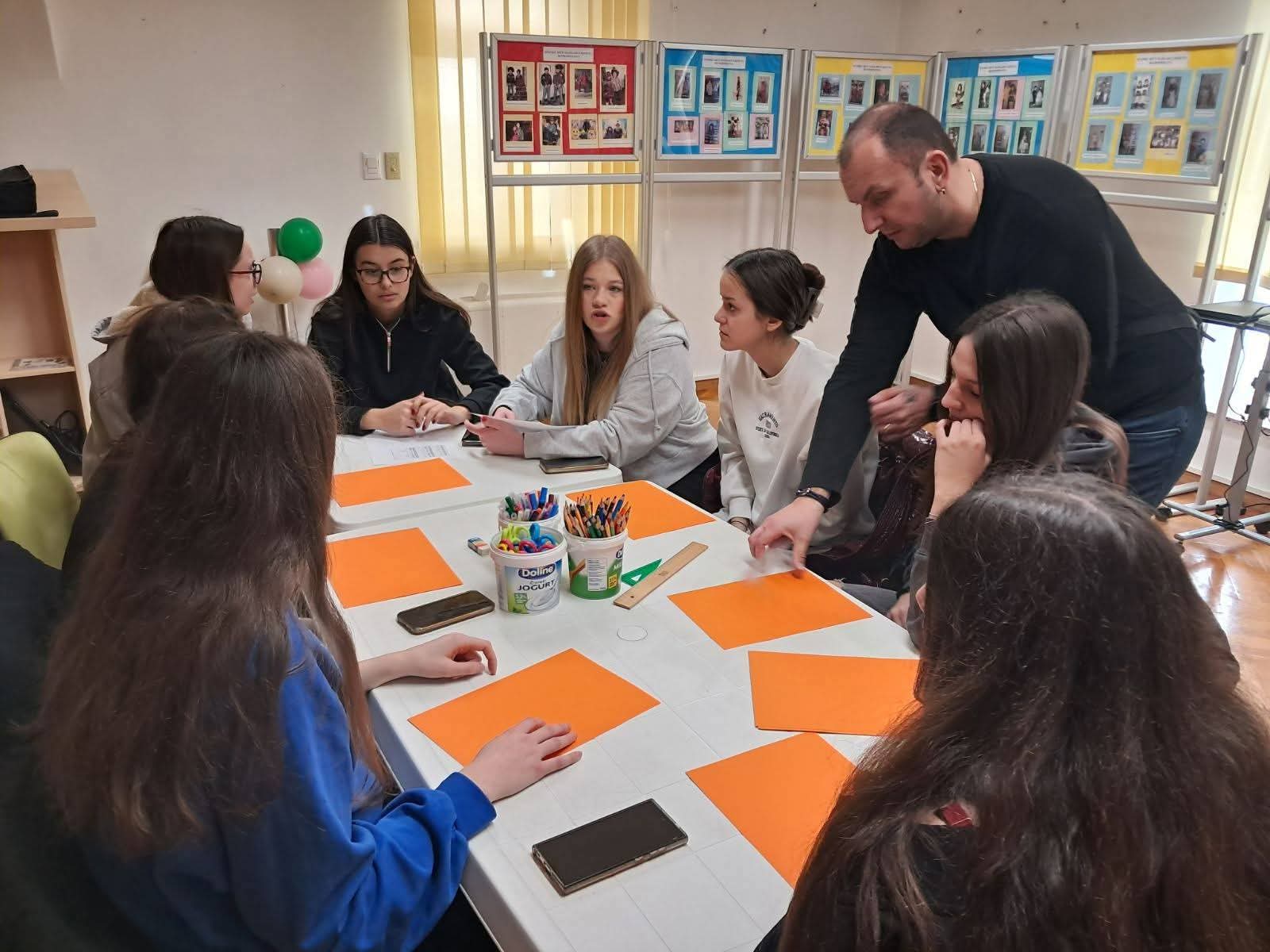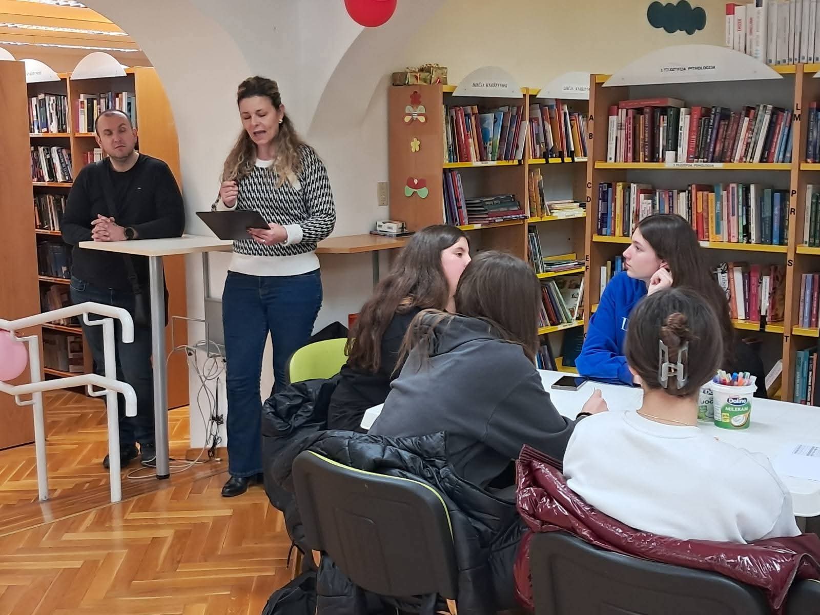 U nastavku programa uslijedila je glagoljska radionica -srednjoškolci su izrađivali glagoljični natpis knjižnica Senj koji će krasiti predvorje senjske knjižnice.