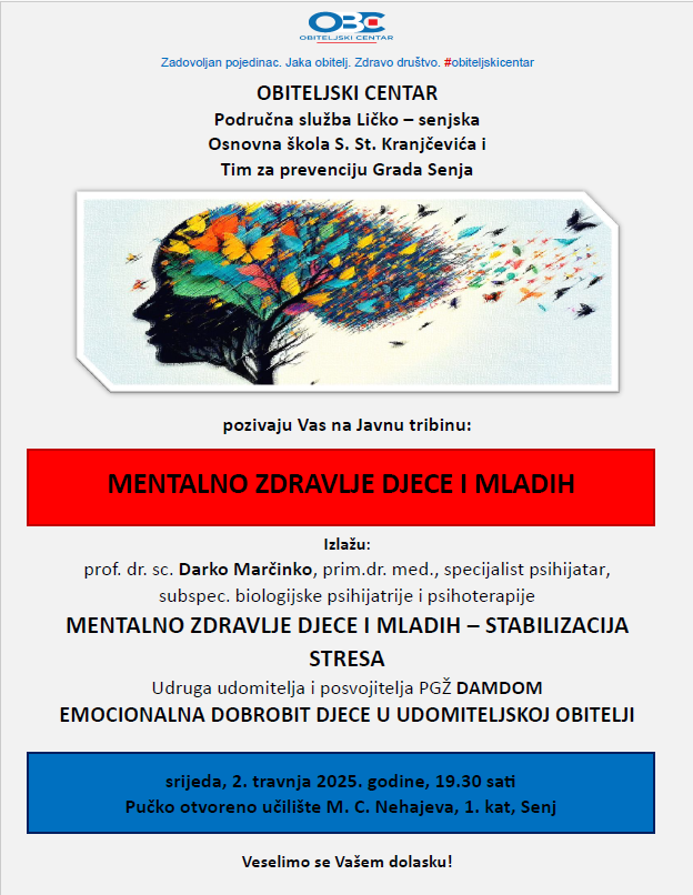 – Mentalno zdravlje djece i mladih – stabilizacija stresa, prof. dr. sc. Darko Marčinko, prim.dr.med., specijalist psihijatar, subspec. biologijske psihijatrije i psihoterapije