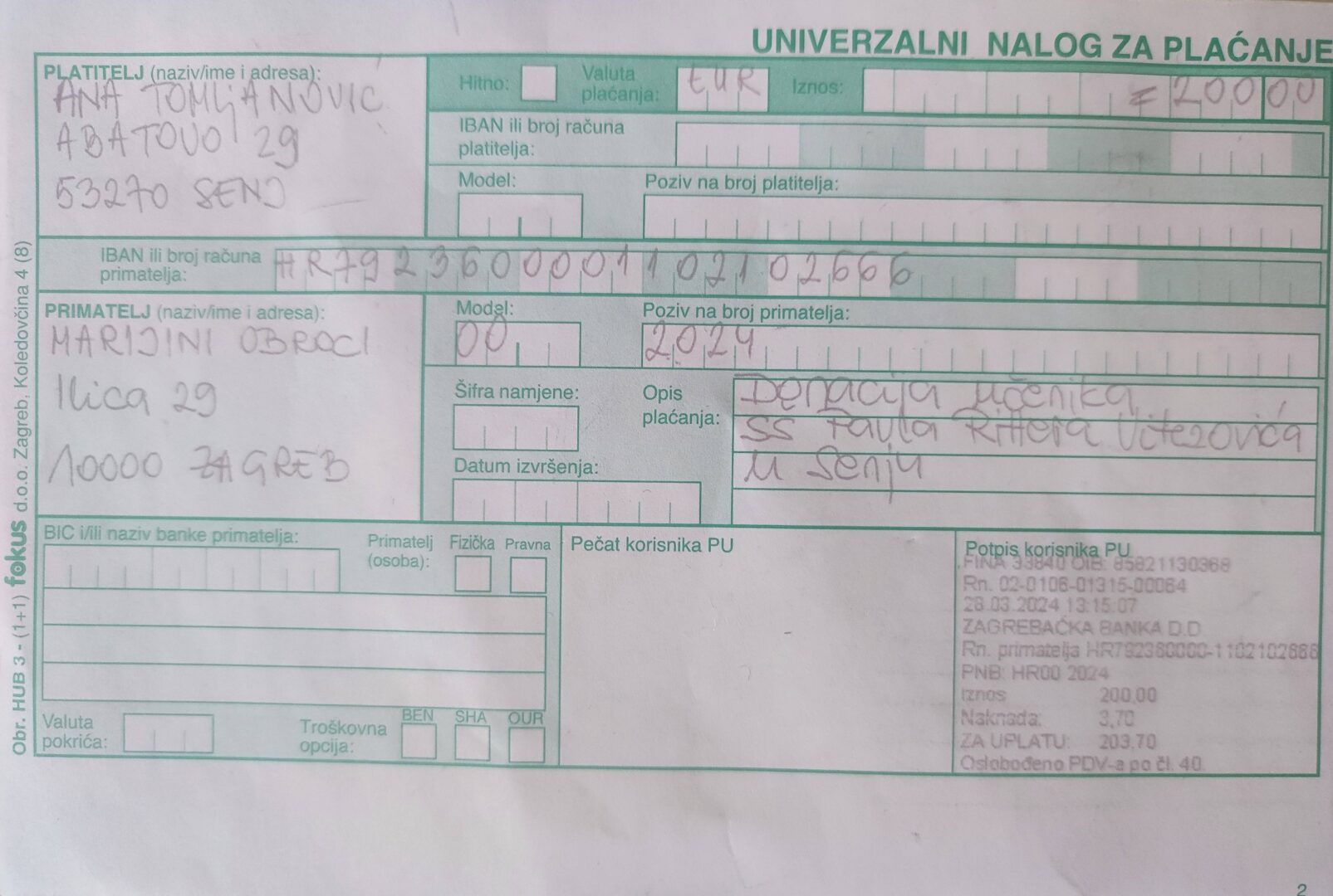U sklopu humanitarne akcije Mala djela, velika razlika naša se škola i ove godine uključila u humanitarnu akciju Marijini obroci. Dio svog džeparca učenici su nesebično darovali za siromašnu i gladnu djecu u svijetu i tako im dali priliku da i oni pohađaju školu i obrazuju se.