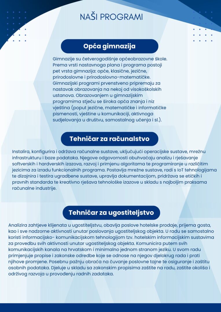 Upisi Prijave i upisi na mrežnoj stranici Nacionalnog informacijskog sustava prijava i upisa u srednje škole (NISpuSŠ) Priloženi dokumenti: Natjecaj_za_upis_2025.-2026._jesenski_rok Natjecaj_za_upis_ucenika_u_I._razred Odluka_o_upisu_u_prvi_razred_25_26 Pravilnik_o_elementima_i_kriterijima_final Brošura: